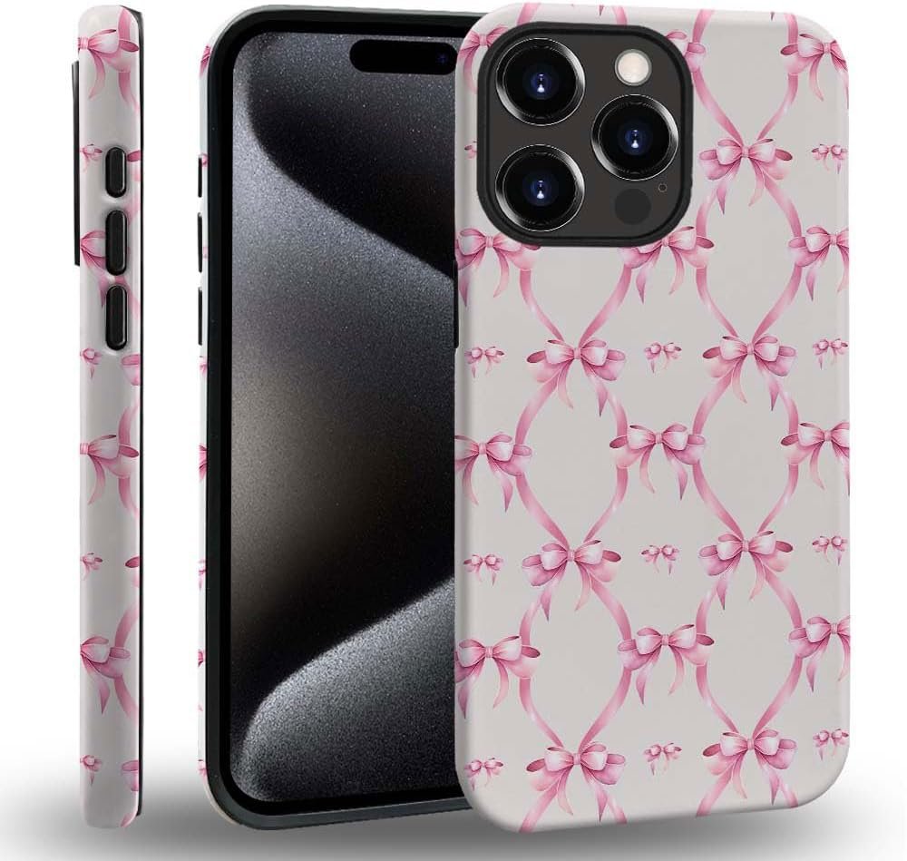 for iPhone 15 Pro Case,HH2 Pink Bow Ribbon Hybrid 2 Layer Hard Shell Silicone Protective Pattern Design Case